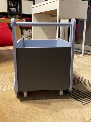 Carrito de madera para juguetes, ideal para que los más pequeños almacenen sus tesoros. Tiene un diseño encantador con estrellas. - Color azul claro con estrellas blancas. - Laterales grises. - Ruedas para facilitar el movimiento. En muy buenas condiciones. Poco uso.