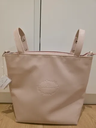 Bolso de carrito de la marca Pasito a Pasito en color rosa bebé. - Nueva a estrenar, sin uso. - Diseño clàsico de la marca, elegante y funcional. - Logo de la marca en la parte frontal. - Asas superiores para acoplar cómodamente en el carrito y una asa larga para llevar como bolso. - Cierre con cremallera y bolsillos/compartimentos interiores.