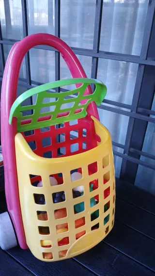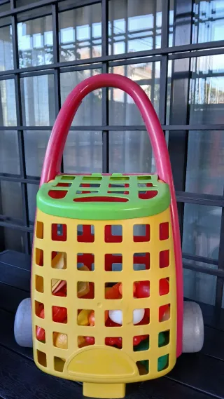 Carrito de la compra de juguete, ideal para que los más pequeños jueguen a hacer la compra. Incluye frutas y verduras de plástico. Un poco descolorido por el sol pero continúa siendo un buen juego. Esta todo labado, limpio.