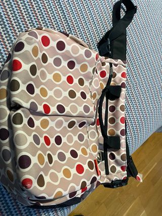 Práctica bolsa con un diseño divertido de círculos y ondas en tonos beige, burdeos, rojo y marrón. Ideal para llevar lo necesario para los más pequeños. - Estampado colorido y original. - Compartimentos exteriores. - Cierre de cremallera. - Se adjunta Cambiador portatil.