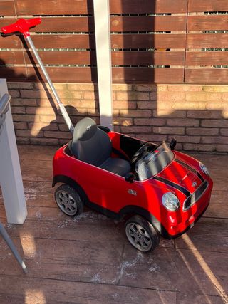 Cochecito tipo carrito con diseño de Mini Cooper para niños. Ideal para paseos divertidos. - Color rojo vibrante. - Asiento cómodo. - Ruedas resistentes. - Volante y parabrisas.