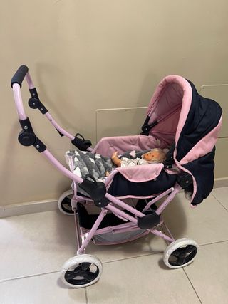Preciosa carreola para muñecas, en color azul marino y detalles rosas. Está en muy buen estado. - Incluye capazo y bolso a juego. - Diseño elegante y compacto. - Perfecto para niñas a las que les guste cuidar muñecas.
