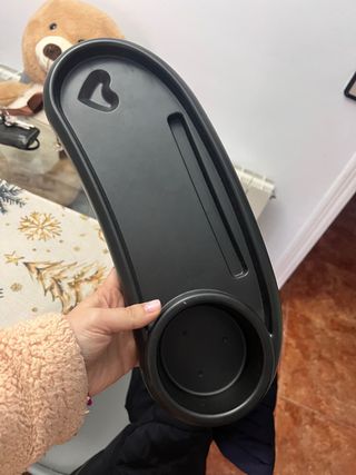 Bandeja negra para carrito de bebé con portavasos. - Diseño con hueco en forma de corazón. - Ranura para objetos. - Compartimento para bebidas.