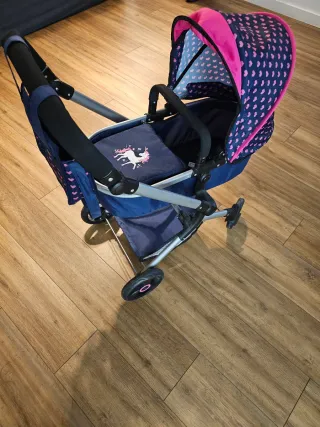 Carrito de muñecas con un diseño encantador. Perfecto para jugar. - Estampado de corazones rosas sobre fondo azul marino. - Detalle de unicornio bordado en el cojín. - Capota ajustable. - Ruedas delanteras giratorias.