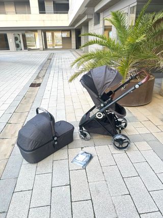 Carrito de bebé cómodo y funcional, ideal para paseos. - Diseño moderno y elegante. - Estructura resistente y ligera. - Capazo convertible. - Ruedas todoterreno.