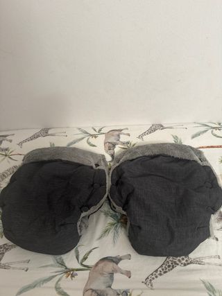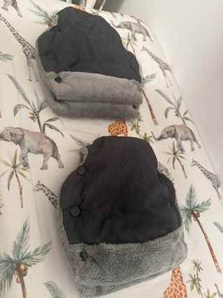 Manoplas de tejido suave para mantener las manos calientes en el carrito. - Color gris oscuro y gris claro. - Forro interior de pelo sintético. - Cierre con botones a presión.