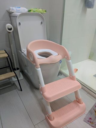 Asiento adaptador para inodoro infantil en color rosa, con escalera incorporada para facilitar el acceso, ajustable y como nueva (mobiclinic rosa y blanca, regulable en altura, plegable y fácil de limpiar.