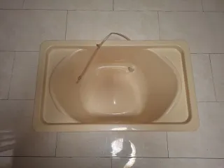 Bañera de plástico para bebés, de color crema. Es ligera y fácil de usar. - Diseño ergonómico. - Bordes suaves para mayor seguridad.