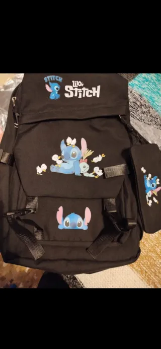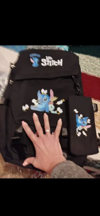 Mochila negra con estampado de Lilo y Stitch. - Diseño frontal con Stitch y amigos. - Estampado de Stitch en la parte superior. - Incluye un pequeño neceser a juego.