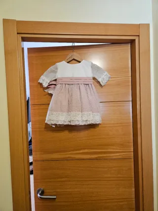 Solo con un uso esta nuevo talla 2-3 regalo diadema a juego, el vestido costó 145€ Vestido de ceremonia para niña, elegante y bonito. - Parte superior blanca con detalles de encaje en las mangas. - Falda rosa con textura y detalle de encaje en el bajo. - Cinturón rosa a juego.