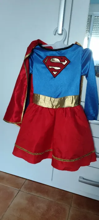 Disfraz de Supergirl para niños, ideal para fiestas o juegos. - Incluye vestido azul y rojo con capa y lo que simula las botas. - Cinturón dorado. - Logo de Supergirl en el pecho. - Detalles dorados en el borde de la falda y la capa. - Son 5 piezas. Sólo se lo ha puesto unas 3 horas para un pasacalles. Talla 4-6 años, 110cm