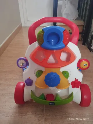 Correpasillos de la marca Chicco con múltiples actividades. - Diseño colorido y atractivo. - Ruedas rojas y azules. - Incluye formas geométricas para encajar.