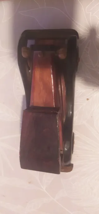 Pieza de colección de un coche clásico, fabricado a mano en madera. - Diseño detallado. - Acabado en tonos madera oscura y rojiza.