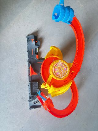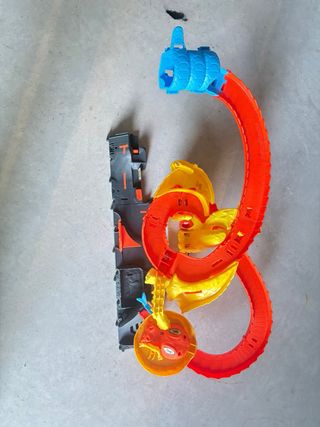 Pista de juego Hot Wheels con temática de dragón y pizza. Incluye varias secciones de pista y accesorios. - Pista de color naranja y amarillo. - Base gris con detalles. - Elemento azul en forma de túnel. - Figura de dragón roja.