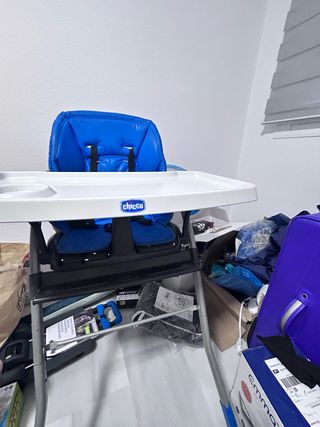 Trona de la marca Chicco en color azul. Es cómoda y segura para los más pequeños. - Asiento acolchado. - Arnés de seguridad de 5 puntos. - Bandeja extraíble. En buen estado