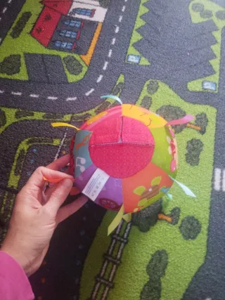 Pelota de actividades VTech con diferentes texturas y colores. - Diseños de animales y globos. - Cintas de tela para estimular el tacto. - Etiqueta VTech visible.