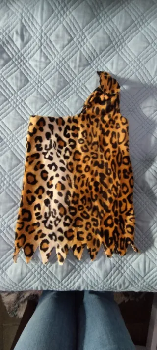Disfraz de cavernícola con estampado de leopardo. Ideal para fiestas temáticas o disfraces familiares. Disfraz niña 3 años y de mujer - Diseño de una sola manga. - Corte asimétrico en el bajo. El precio es del conjunto