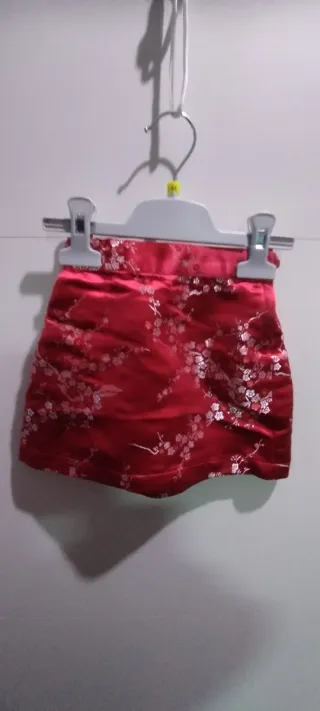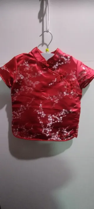 Precioso traje de estilo chino en color rojo vibrante. Presenta un delicado estampado de flores blancas y ramas. - Tejido satinado brillante. - Cierre con nudos tradicionales. - Diseño de manga corta.
