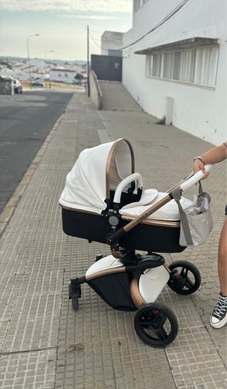 Carro de bebé en perfecto estado, ideal para paseos cómodos. - Incluye capazo y silla. - Diseño moderno en negro y blanco con detalles dorados. - Capota extensible para mayor protección. - Cesta de almacenamiento inferior. - Ruedas todoterreno para todo tipo de superficies.