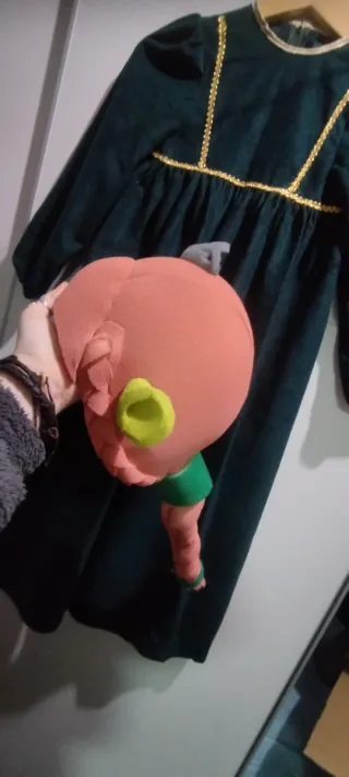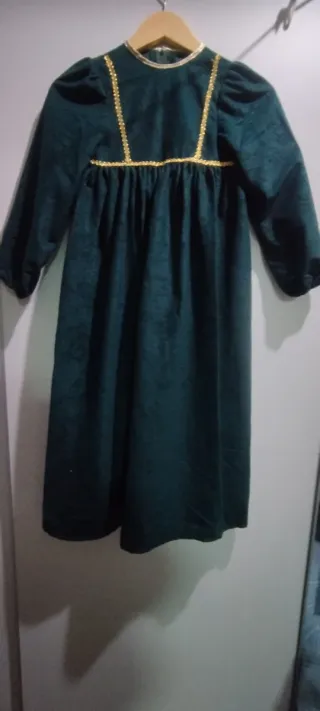 - Tela de terciopelo. - Adornos dorados en el pecho y cuello. - Mangas abullonadas.
