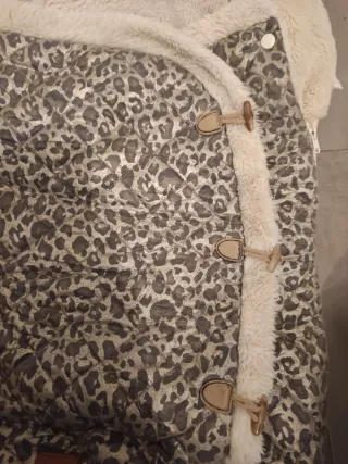 Saco para silla de paseo de la marca Paz Rodríguez. Presenta un estampado de leopardo en tonos marrones y beige, con un forro interior de pelo suave en color crema. - Estampado de leopardo. - Forro interior de pelo. - Cierre con botones y madera.