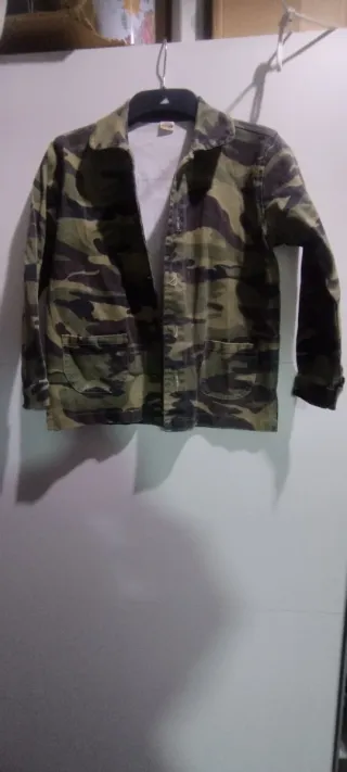 Chaqueta de camuflaje con un parche frontal. - Diseño de camuflaje. - Parche blanco con corazón rojo y texto HAPPY SMILE CREW.