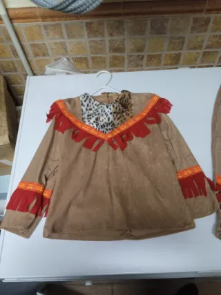 Disfraz de indio para niño, ideal para fiestas temáticas o carnaval. El conjunto incluye una túnica marrón con detalles de flecos rojos y naranjas. - Túnica con cuello adornado. - Mangas con flecos. - Diseño inspirado en la cultura nativa americana. - Pantalón - Delantal. - Tira con plumas para la cabeza.
