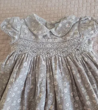 Conjunto de vestido y braguita para niña de 18 meses. El vestido es de manga corta con cuello camisero y detalles de smock en el pecho. La tela tiene un estampado floral en tonos grises y blancos. - Vestido de manga corta. - Braguita a juego. - Estampado floral. - Talla 18 meses.