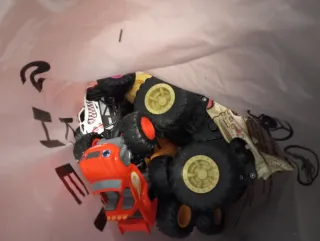 Circuito de juguete flexible para construir. - Piezas de colores variados: naranja, amarillo, azul y verde. - Dos coches con luces