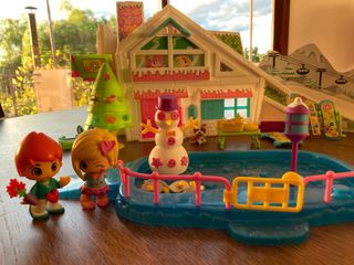 Casa de la nieve, con 13 muñecas de Pinypon y muchos accesorios extras. La casa incluye salón con chimenea, ascensor, habitacion y en el exterior una pista de hielo para patinar. El cartón que forma parte de la decoración de la casa tiene marcas de uso y una pieza de plástico ya no mueve con mucha fluidez. Aparte de esto, la casa y las muñecas están en perfectas condiciones.