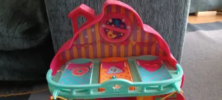 casa de muñecas de la marca Bellies. la cinta funciona con pilas al igual que los accesorios. los dibujos a cartón del fondo por la parte de abajo están un poco rotos, y la base del tobogán está un poco pintada pero por el resto está como nueva.