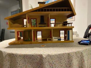 Encantadora casa de muñecas de madera con muy poco uso y diseño moderno y colorido. Incluye muebles y dos muñecos, todo de madera. Alto: 70 cm Largo: 75 cm Fondo: 30 cm La casa está en perfecto estado, casi no la han usado y de hecho de pueden ver aún las pegatinas del montaje. No tiene ningún desperfecto, salvo que mi hijo pequeño ha puesto un sello con su nombre en uno de los lados del tejado, como muestro en la foto (es muy pequeño como se ve): - Estructura de madera natural. - Techos inclinados con detalles blancos. - Paredes interiores decoradas con estampados. - Balcones y puertas de colores vivos.