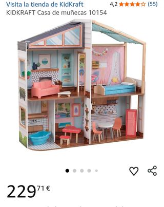 Casa de muñecas de madera de la marca KidKraft, con un diseño moderno y colorido. IMPORTANTE LEER: Está desmontada y es posible que falten algunos accesorios. Además alguno de los fondos o maderas pueden tener desperfectos estéticos (ejemplos en las últimas fotos). Nueva en Amazon cuesta alrededor de 240€. - 4 pisos, 8 habitaciones y una terraza en la azotea. Altura de 123,5cm. - Incluye armario extra de Barbie (se puede ver en las fotos) - Incluye manual de montaje.