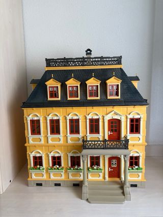 Casa de juguete Playmobil con múltiples habitaciones y accesorios con instrucciones de montaje. - Incluye figuras. - Diseño de casa de tres plantas. - Escaleras y balcones. - Accesorios de mobiliario y decoración. De regalo añado parque de juegos y más muñecos