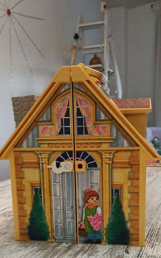 Preciosa casita de muñecas Playmobil, ideal para jugar. Se encuentra en buen estado. - Incluye una casa de muñecas Playmobil. - Diseño de casa con tejado rojo. - Decorada con ilustraciones de personas y plantas.