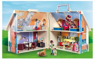 Maletín de Playmobil que se abre para revelar una casa de muñecas. - Incluye dos plantas con diferentes estancias. - Mobiliario y figuras de Playmobil.
