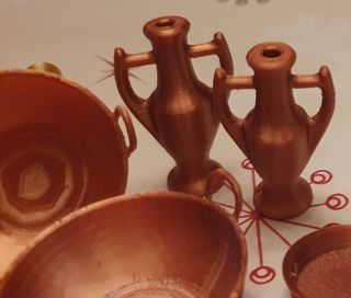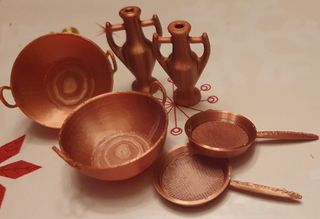 Formado por 2 pequeñas ánforas, 2 pequeñas sartenes, 2 pequeñas ollas/cuencos con asas. Ideales para cualquier diorama, escenarios, casa de muñecas o Belén de Playmobil.