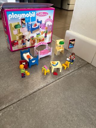 Playmobil 5595 Habitación Infantil, en buen estado. Incluye dos camas, mesitas de noche, un escritorio, dos sillas y dos figuras Playmobil. Ideal para completar una casa de muñecas Playmobil. - Perfecto para niños y niñas. - Dos camas con detalles encantadores. - Incluye dos figuras Playmobil. - Complementos para decorar la habitación.