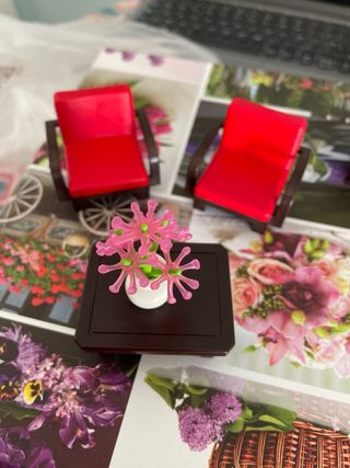 Conjunto de muebles Playmobil para salón. Ideal para completar la casa de muñecas. - Incluye dos sofás rojos y una mesa de centro marrón. - Los sofás son pequeños y de color rojo intenso. - La mesa es oscura y compacta.
