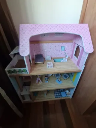 Casa de muñecas de madera con varios niveles y habitaciones. - Diseño de tres plantas. - Techo a dos aguas con detalles. - Balcón en la planta superior. - Escaleras interiores. - Habitaciones decoradas con papel pintado. - Incluye mobiliario y figuras.