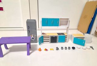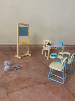 Conjunto de muebles para muñecas Barbie, ideal para recrear un aula escolar. El set incluye un escritorio con silla y escritorio, pc, cascos auriculares, dos pupitres con sillas, un pizarrón y una radio-casete. También se incluyen pesas para añadir un toque deportivo, para las clases de gimnasia. Los muebles son de color amarillo pastel y azul claro, en buen estado y listos para jugar. antiguo antigua clasico clasica Mobiliario, muebles muñecas, casas de muñecas, dioramas, escuela, colegio de muñecas, Barbie, Sindy, Monster Hight, pizarra, años 90, nostalgia, Sindy, Chabel, Monster Hight o similar. Vintage, de años 90. pvc