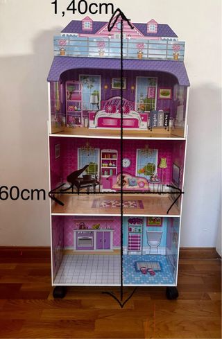 Preciosa casa de muñecas de madera con ruedas, de varios niveles con 10 habitaciones. Se regalan 2 barbies y posibilidad de negociar precio añadiendo un coche.