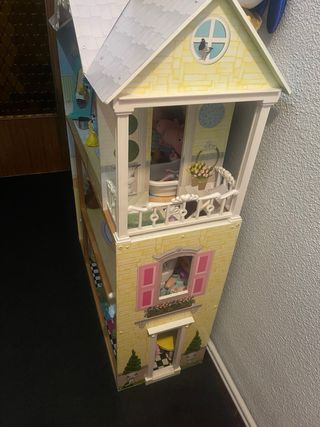 Casa de muñecos, de dos pisos. Con diferentes habitaciones para jugar. Tiene el sonido de llamar a la puerta Tiene accesorios y personajes como se ve en las imágenes. En la última se ven las dos piezas rotas