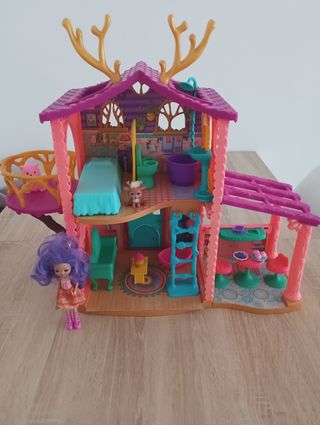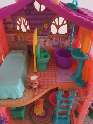 Preciosa casa de juegos Enchantimals, en muy buen estado. Ideal para jugar y estimular la imaginación. - Incluye una casa de dos pisos con detalles encantadores. - Cuenta con una escalera, tobogán y balcón. - Perfecta para muñecas Enchantimals (muñecas no incluidas).