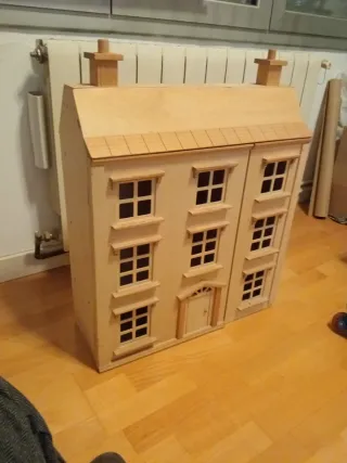 Casa de muñecas de madera, ideal para horas de juego. Se vende sin accesorios. - Construcción robusta de madera. - Diseño de casa de tres plantas más buhardilla. - Ventanas y puerta detalladas. - La vendo por la mitad de su precio.