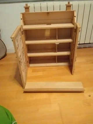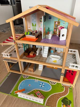 Casa de muñecas de madera con varios niveles y muchos accesorios. - Incluye muebles y figuras. - Diseño detallado con habitaciones. - Balcón y tobogán. Medidas: 70 largo x 70 alto x 35 fondo Está usada pero en buenas condiciones. Tiene marca y algún mueble tiene una pequeña pintada. En general, está muy bien.