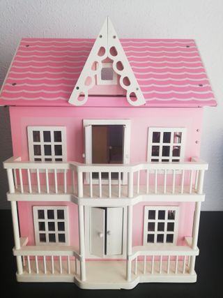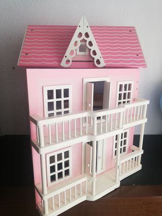 Casa de muñecas de madera en color rosa, ideal para juegos infantiles. Se encuentra en perfecto estado. - Estructura de madera. - Techo y chimeneas rojas. - Ventanas blancas. - Puerta de entrada arqueada.