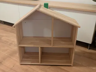 Casa de muñecas de madera de la serie Flisat de IKEA. Ideal para jugar y decorar. - Estructura de madera clara. - Dos estantes interiores. - Techo a dos aguas.