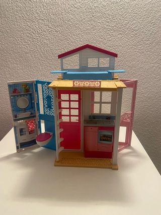 Maletín que se abre para revelar una casa de muñecas Barbie de dos pisos. Incluye cocina y baño. - Diseño plegable tipo maletín. - Cocina equipada con horno y fregadero. - Baño con inodoro y lavabo. - Techo a dos aguas con detalles en rojo.