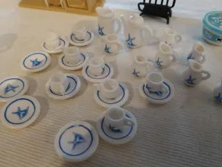 Conjunto de miniaturas para casa de muñecas, ideal para coleccionistas o para añadir detalles a tu casa de muñecas. - Variedad de piezas de cerámica y otros materiales.juego cafe plástico,cerámica y otro madera - Incluye vajilla, muebles y accesorios. - Diseños detallados y coloridos. Lavabo con armario papel wc Botellitas jarras vasos Comiditas. Para casa Barbie etc Preguntar precios . No envio